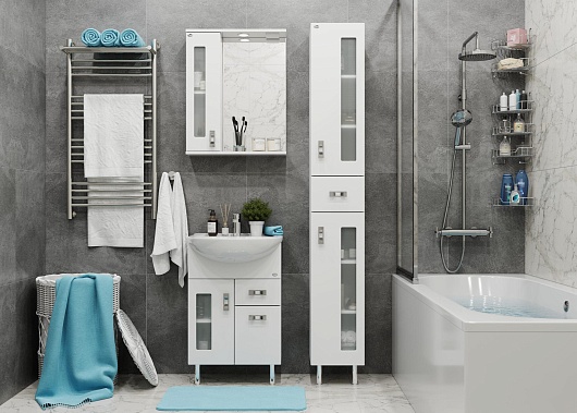 - Влагостойкое зеркальное полотно с полочкой, справа - шкафчик с распашной дверцей из МДФ, декорированный вставкой из матового, закаленного стекла.