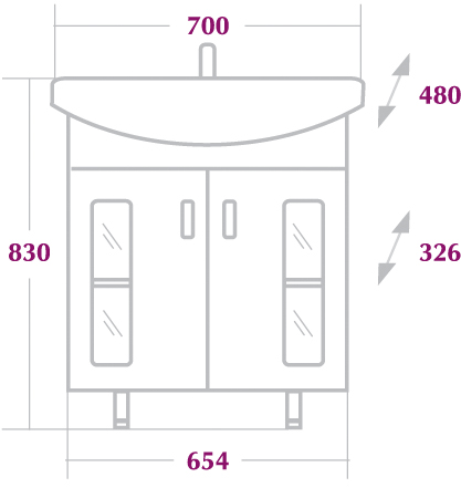- тумба под раковину: две распашные дверцы, полка внутренняя, ручки - металл (хром), ножки передние (регулируемые) - металл (хром), ножки задние (регулируемые) - пластик
