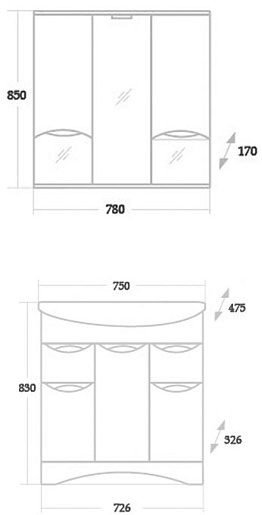 Описание: напольная тумба с тремя распашными дверцами и двумя выдвижными ящиками, фасады и корпус из MDF, фурнитура хром, фаянсовая раковина Лагуна 75 (Dreja).