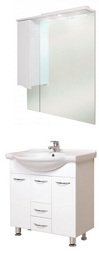 Комплектация: Зеркальное влагостойкое полотно, слева шкафчик с распашной дверцей и полочками. Два галогеновых светильника, выключатель, розетка. Фасад из МДФ, корпус — ЛДСП, хромированная фурнитура.