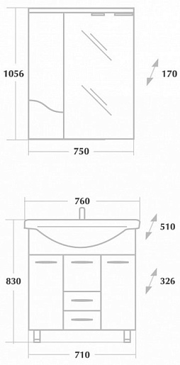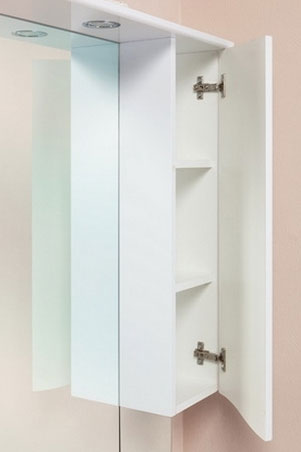 Комплектация: Зеркальное влагостойкое полотно, справа шкафчик с распашной дверцей и полочками. Два галогеновых светильника, выключатель, розетка. Фасад из МДФ, корпус — ЛДСП, хромированная фурнитура.