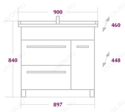- тумба под раковину: дверь распашная, полка внутренняя, выдвижные ящики, ручки - металл (хром, ножки передние (нерегулируемые) - металл (хром), ножки задние (регулируемые) - пластик.