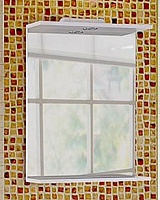 Комплектация: влагостойкое зеркальное полотно с полочкой и козырьком. Подсветка с галогеновой лампой мощностью 12w. Фасад и корпус из влагостойкого ЛДСП с глянцевым покрытием.