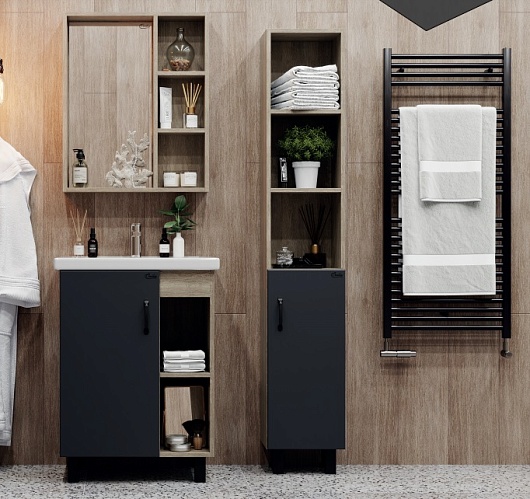 Тимбер 60 – комплект мебели для ванной от отечественного производителя Onika. В его состав входят три важных элемента: умывальник Фостер 60, зеркальный шкаф и тумба под раковину. Цвет умывальника – белый, цвет ЛДСП, из которого изготовлена мебель – серый/дуб сонома. Комплект будет отличным выбором для почитателей стиля лофт и всех тех, кто любит оригинальные дизайнерские решения.