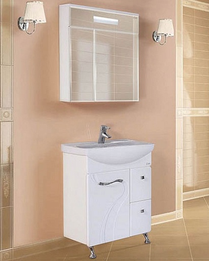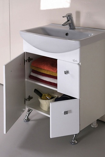 - тумба под раковину: 3 распашных дверцы, вкладная полка, 3 ручки (хром), 4 ножки, комплект полкодержателей