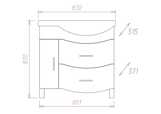 - тумба под раковину: 2 выдвижных ящика, дверка.