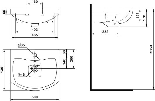 - Одно отверстие под смеситель.