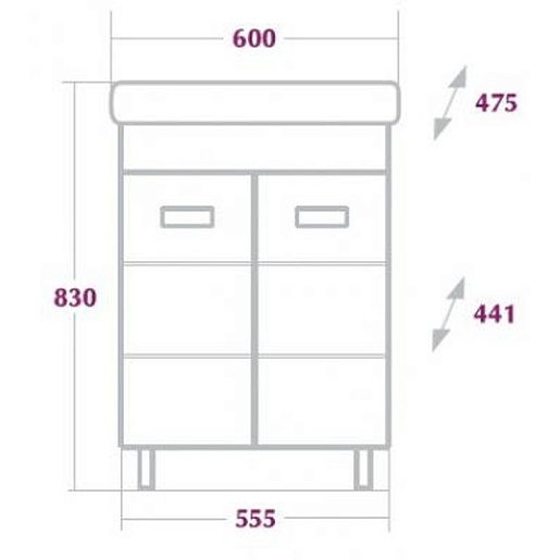 - тумба под раковину: полка внутренняя, ручки врезные - металл (хром), ножки передние - пластик (хром), ножки задние (регулируемые) - пластик