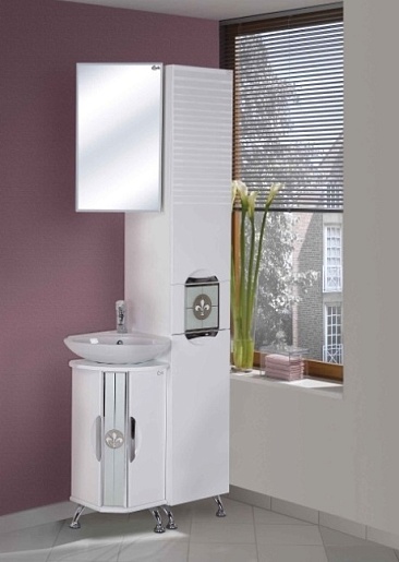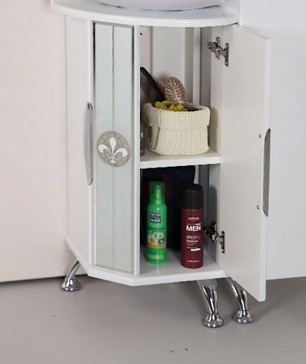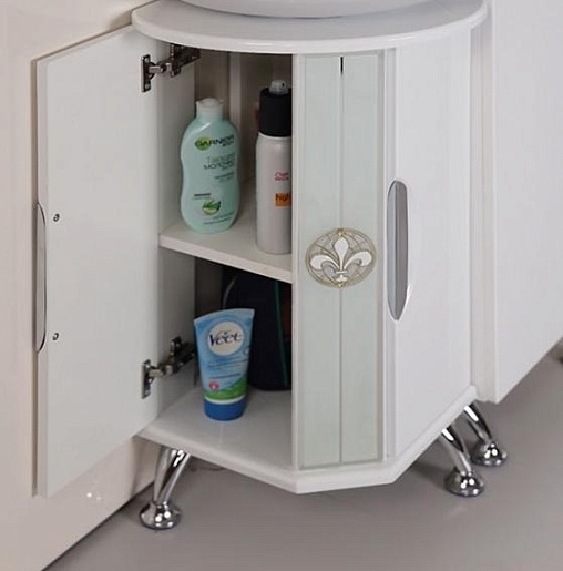 - тумба под раковину: 2 распашные дверцы, 2 ручки - металл (хром), 2 вкладные полки, 2 ножки - металл (хром), комплект полкодержателей, комплект доводчиков.