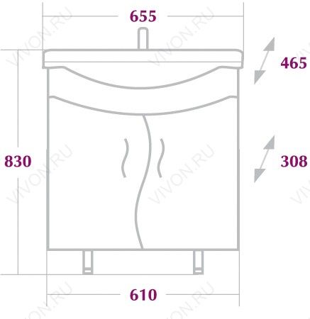 Комплектация: две распашные дверцы, фасад из MDF, корпус — ЛДСП. Укомплектована умывальником Mia-65 (Della)