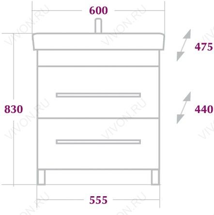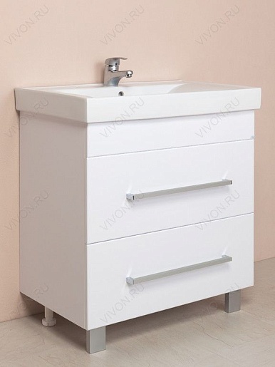 Комплектация: Тумба с раковиной "Тигода 60" и двумя выдвижными ящиками, регулируемые по высоте ножки. Фасад и корпус — МДФ, хромированая фурнитура.