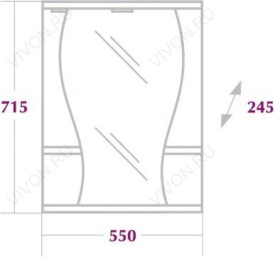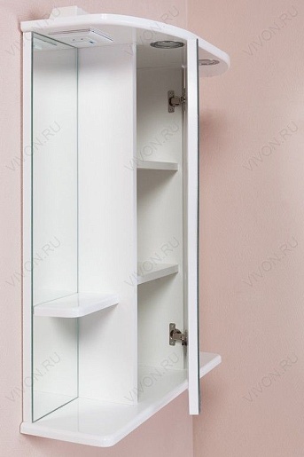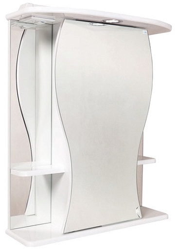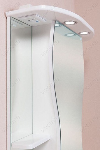 Комплектация: Шкаф оборудован трансформатором мощностью 60 Вт для подключения галогенных светильников со скрытым подключением электропровода, выключателем и розеткой. Зеркальная распашная дверца нестандартной формы, петли слева.