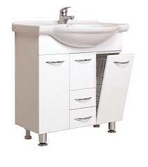 Комплектация: Зеркальное влагостойкое полотно, справа шкафчик с распашной дверцей и полочками. Два галогеновых светильника, выключатель, розетка. Фасад из МДФ, корпус — ЛДСП, хромированая фурнитура.