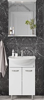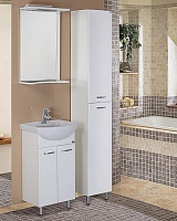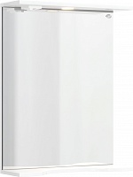 Комплектация: влагостойкое зеркальное полотно с полкой, справа по вертикали расположены две открытые полочки из МДФ. В подсветка, выключатель и розетка.
