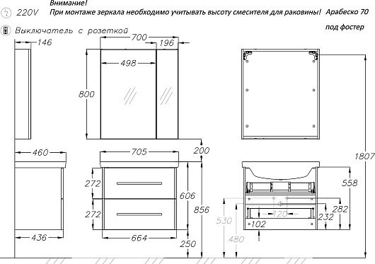 Комплектация: тумба, раковина, зеркальный шкаф.