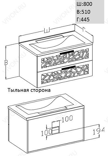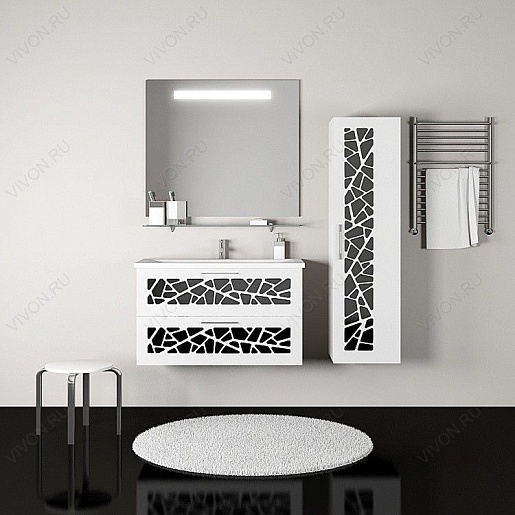 Описание: подвесная тумба с двумя выдвижными ящиками, декорированными оригинальным черно-белым орнаментом в стиле сафари. В комплект входит раковина из литьевого мрамора.