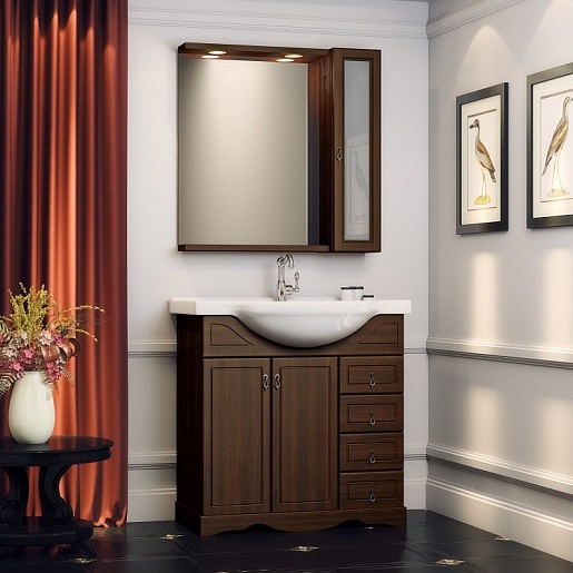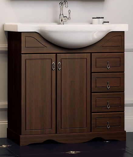 Описание: тумба с двумя распашными дверцами и ящиками, выполнена из массива бука. В комплект входит керамическая раковина "Дрея 85" .