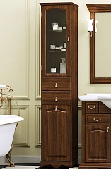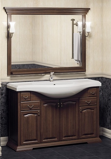 Описание: напольная тумба с распашными фасадами и выдвижными ящиками для удобства организации хранения, выполнена из массива бука, тонированного в темный цвет. В комплект входит раковина Кировит Классик 1200 из фаянса.