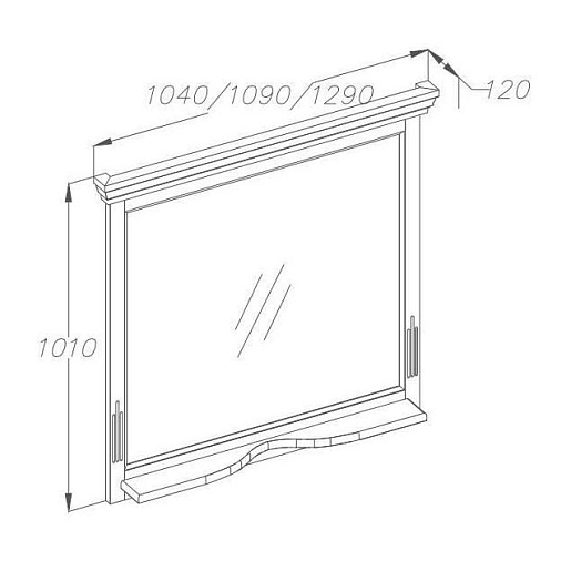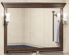 Описание: влагостойкое зеркальное полотно в классической раме из массива бука, тонированной в темный цвет, с двумя изящными светильниками в матовых плафонах и полкой.