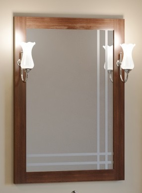 Описание: влагостойкое зеркальное полотно в классической раме из массива бука, тонированной в темный цвет. В комплект входят светильники Рустика.