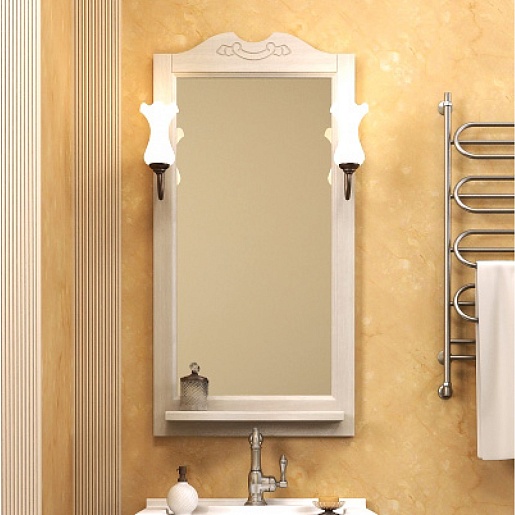Описание: влагостойкое зеркальное полотно в раме из массива дерево, два классических светильника.