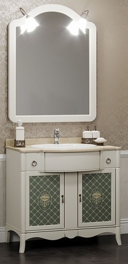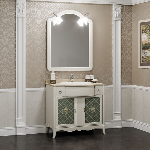 Описание: напольная тумба с двумя выдвижными ящиками и двумя распашными дверцами со стеклянными вставками, декорированными золотистой раскладкой, выполнена из массива бука. Эффект патины и бронзовая фурнитура подчеркивают классический стиль и сдержанный итальянский шик тумбы. В комплект входит раковина и столешница из натурального мрамора.