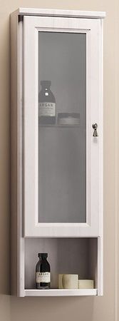 Описание: узкий подвесной шкаф-колонка для ванной с открытой нишей и застекленным распашным фасадом (петли слева). Внутреннее пространство оборудовано полкой из матового стекла.