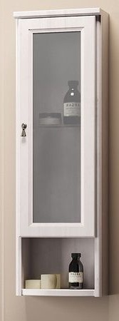 Описание: узкий подвесной шкаф-колонка для ванной с открытой нишей и застекленным распашным фасадом. Внутреннее пространство оборудовано полкой из матового стекла.
