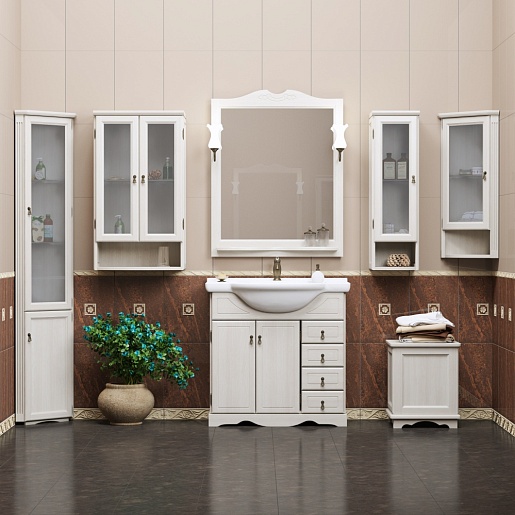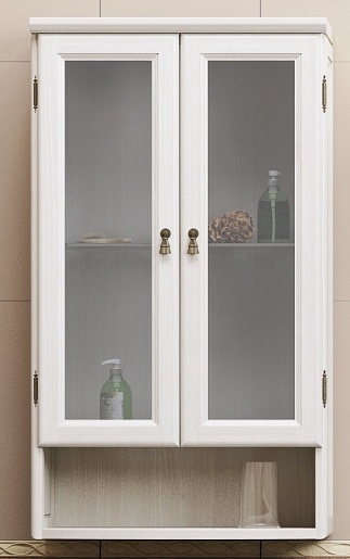 Описание: подвесной шкаф для ванной с открытой нишей и двумя застекленными распашными фасадами. Внутреннее пространство оборудовано двумя полками из прозрачного стекла.