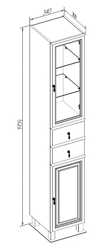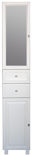 Описание: напольный пенал для ванной с верхней распашной дверцей, двумя выдвижными ящиками в центре и нижним распашным фасадом. Внутренне пространство верхнего отделения оснащено двумя полками. Пенал выполнен из массива бука.