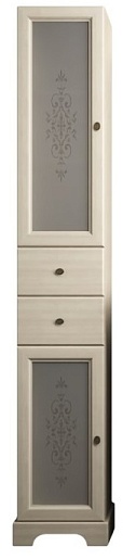 Описание: напольный пенал для ванной с распашными фасадами, декорированными вставками из стекла с узором, выдвижными ящиками в центре. Внутренне пространство оснащено полками. Пенал выполнен из массива бука.