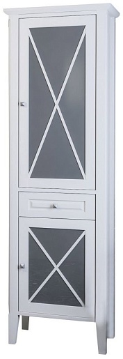 Описание: напольный пенал для ванной с распашными дверцами и выдвижным ящиком. Внутренне пространство оборудовано полками. Пенал выполнен из массива бука и декорирован вставками из стекла.