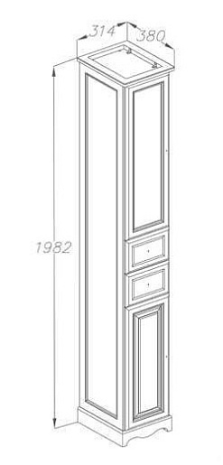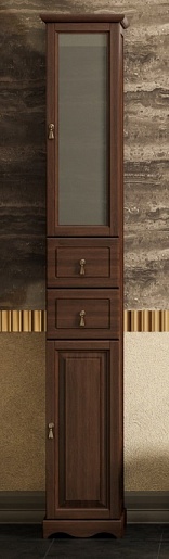 Описание: напольный пенал с двумя выдвижными ящиками и распашными фасадами, декорированной полупрозрачным стеклом. Пенал выполнен из массива бука, тонированного в темный цвет. Отделения оснащены вкладными полками для удобства организации хранения.