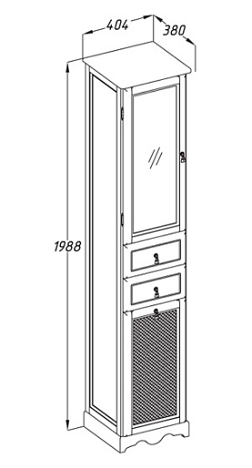 Описание: напольный пенал для ванной с верхней распашной дверцей, двумя выдвижными ящиками в центре и нижним фасадом. Внутренне пространство верхнего отделения оснащено двумя полками. Пенал выполнен из массива бука.