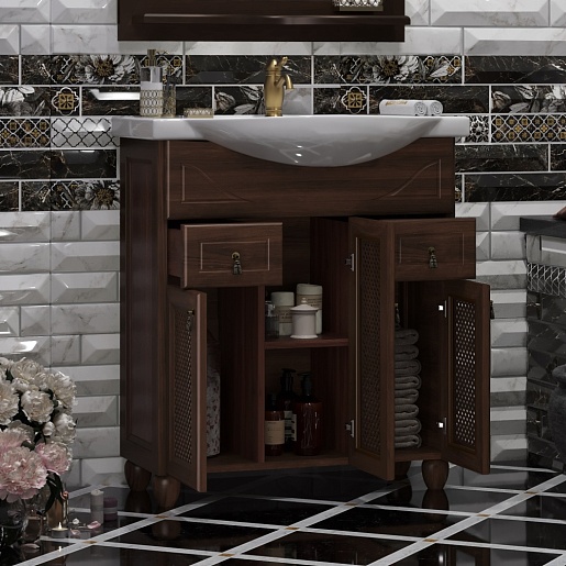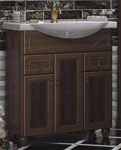 - Тумба под раковину напольная Тибет 75: массив бука, распашные фасады с декоративной решеткой, выдвижные ящики, фурнитура - бронза.
