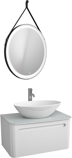- Тумба под умывальник Als 80: скрытые доводчики плавного закрывания полного выдвижения, подвесной регулируемый механизм, столешница из стекла лакобель