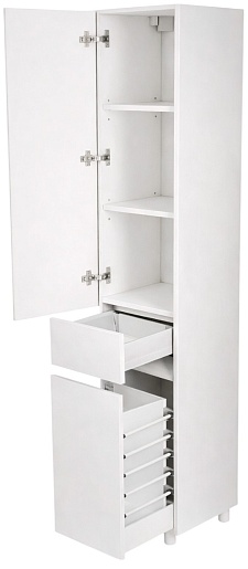 - Система хранения: 1 распашная дверка в верхней части корпуса, выдвижной ящик, выдвижная бельевая корзина.