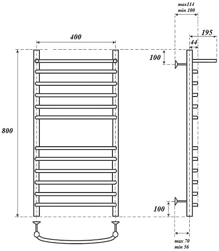 Комплектация: полотенцесушитель, телескопическое крепление к стене (4 шт.), ТЭН с терморегулятором.