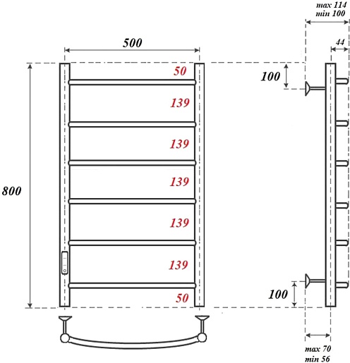 Комплектация: полотенцесушитель, телескопическое крепление к стене (4 шт.), сетевой кабель.