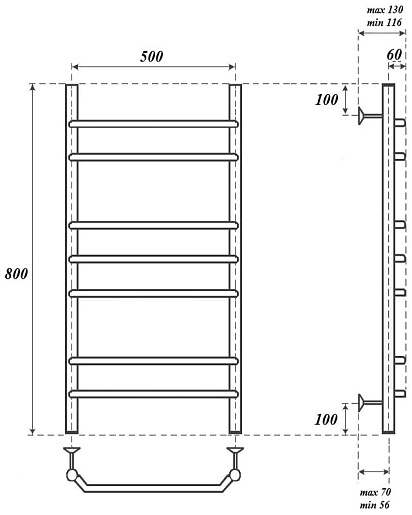Комплектация: полотенцесушитель, телескопическое крепление к стене (4 шт.), ТЭН с терморегулятором.