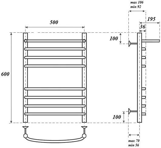 Комплектация: полотенцесушитель, телескопическое крепление к стене (4 шт.), кран Маевского.