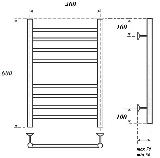 Комплектация: полотенцесушитель, телескопическое крепление к стене (4 шт.), кран Маевского.