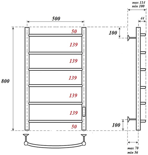 Комплектация: полотенцесушитель, телескопическое крепление к стене (4 шт.), сетевой кабель.