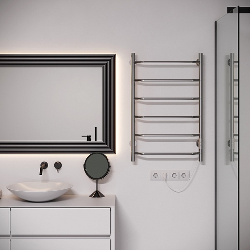 Комплектация: полотенцесушитель, комплект скрытого подключения, нагревательный кабель, выключатель с таймером и терморегулятором, шнур электропитания с вилкой, телескопический держатель (4 шт.).