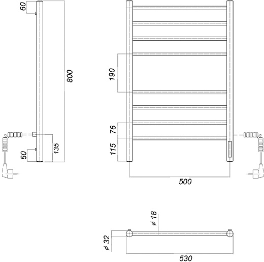 Комплектация: полотенцесушитель, кронштейн (4 шт.), комплект для скрытого подключения, провод с вилкой.