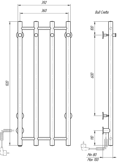 Комплектация: полотенцесушитель, кронштейн (4 шт.), комплект для скрытого подключения, провод с вилкой.