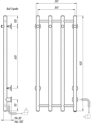 Комплектация: полотенцесушитель, кронштейн (4 шт.), комплект для скрытого подключения, провод с вилкой.