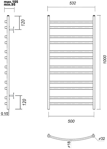 - Диаметр боковых труб: 32 мм.