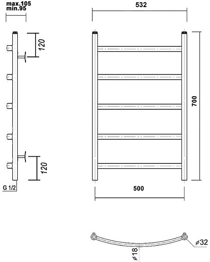 Комплектация: полотенцесушитель, крепление телескопическое (4 шт.), заглушка, кран Маевского, угловой переходник (2 шт.).