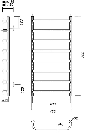 - Диаметр боковых труб: 32 мм.